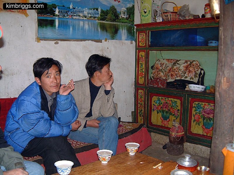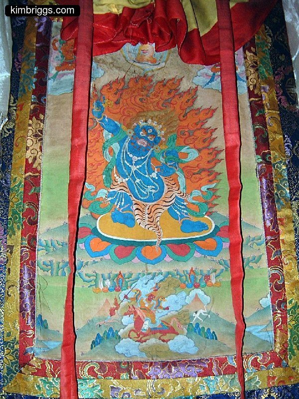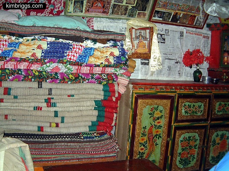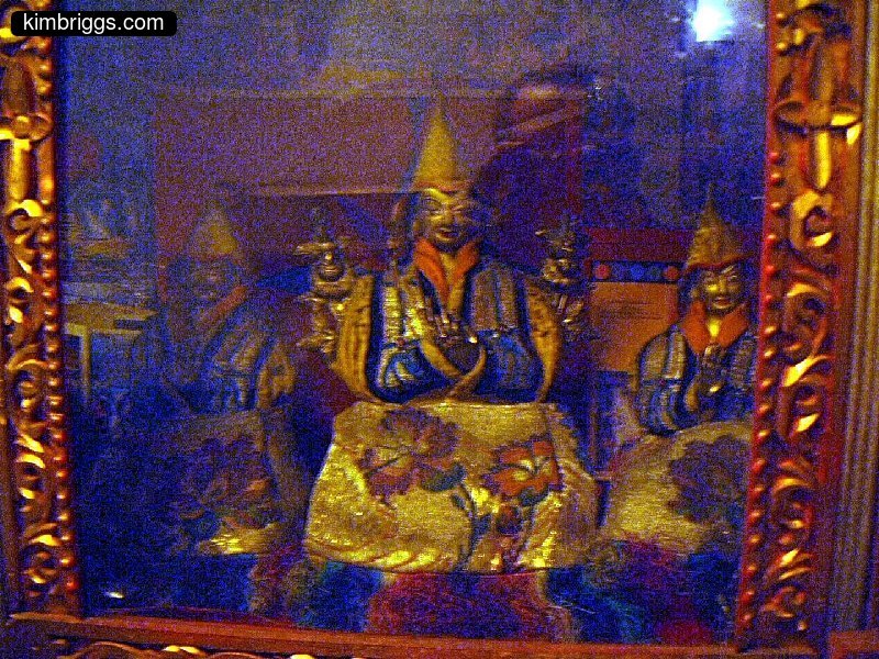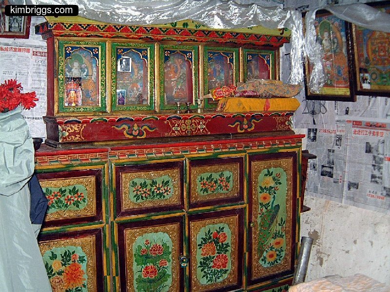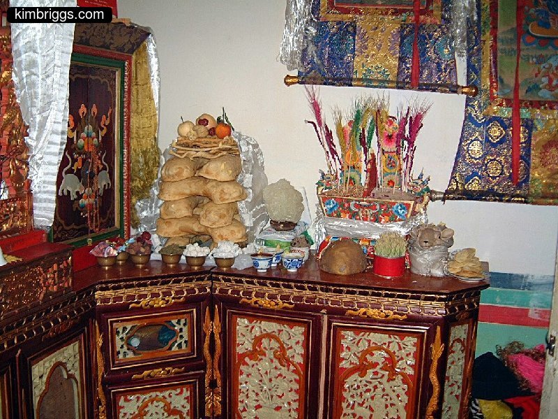 There is a separate slide-show for photos from a multi-story building in the center of Lhasa. Our host fed us buttered yak tea and “sampa”, a mixture of roasted barley flour, yak butter and sugar. Sampa is a bit like dry cookie dough, sweet and tasty; the tea is thick and unlike any I’ve tasted before. The most important room in a traditional Tibetan home is the chapel.