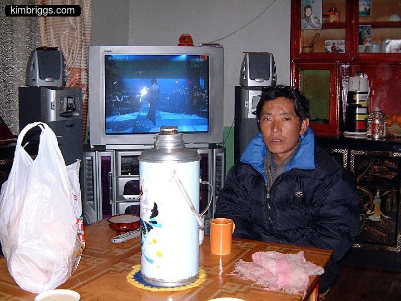 These first four photos are of a home in a multi-story building in the center of Lhasa. Our host fed us buttered yak tea and “sampa”, a mixture of roasted barley flour, yak butter and sugar. Sampa is a bit like dry cookie dough, sweet and tasty; the tea is thick and unlike any I’ve tasted before. Our guide has a better entertainment system than the three of us on the trip. The most important room in a traditional Tibetan home is the chapel.