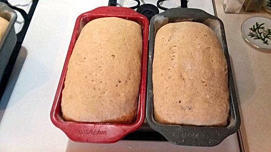 Bread pans: I originally had wider “quick loaf” bread pans someone gave me (shown in the photo of the 2nd rise). There is nothing wrong with them but the bread comes out shorter and narrower. I prefer the 9×5 inch bread pans because it makes the bread closer to “sandwich size”.
